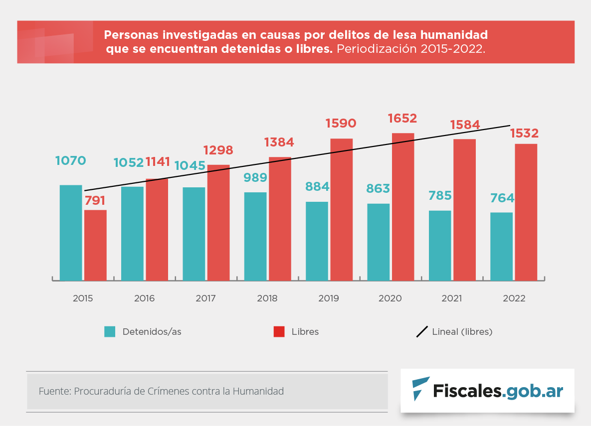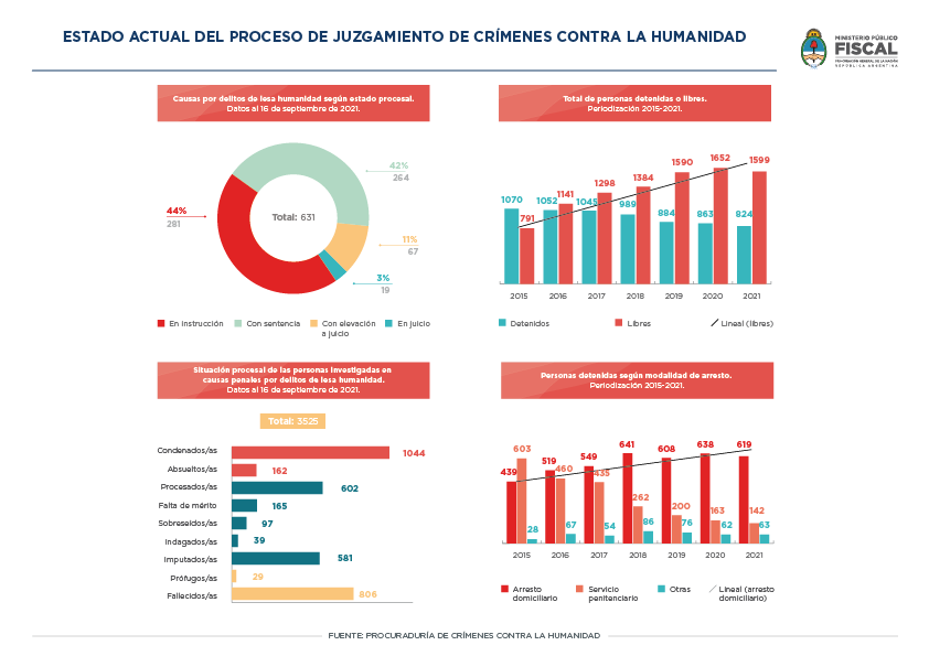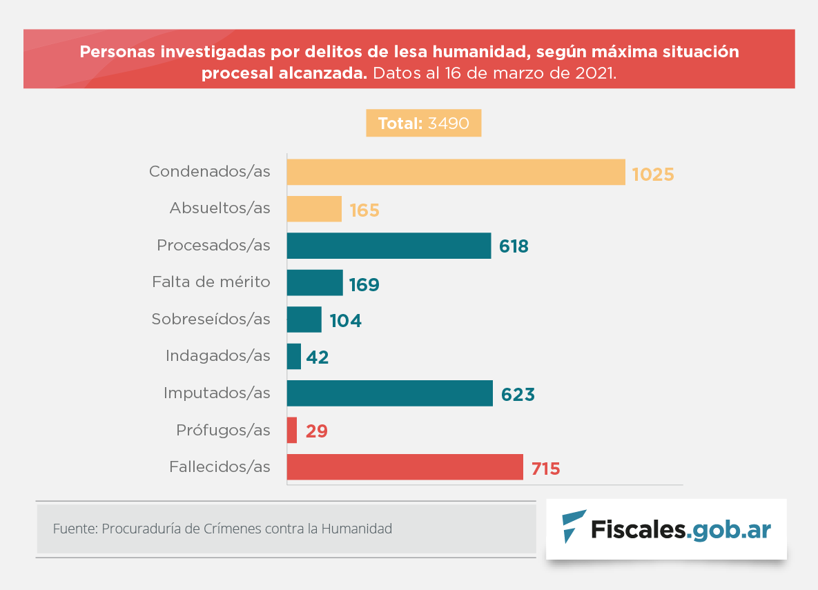 Desde la reapertura de los procesos un total de 3490 personas fueron investigadas. El 25 por ciento están privadas de la libertad; en su mayor parte, en arresto domiciliario. Hay 21 juicios en curso y otros 73 aguardan fecha de inicio de debate.